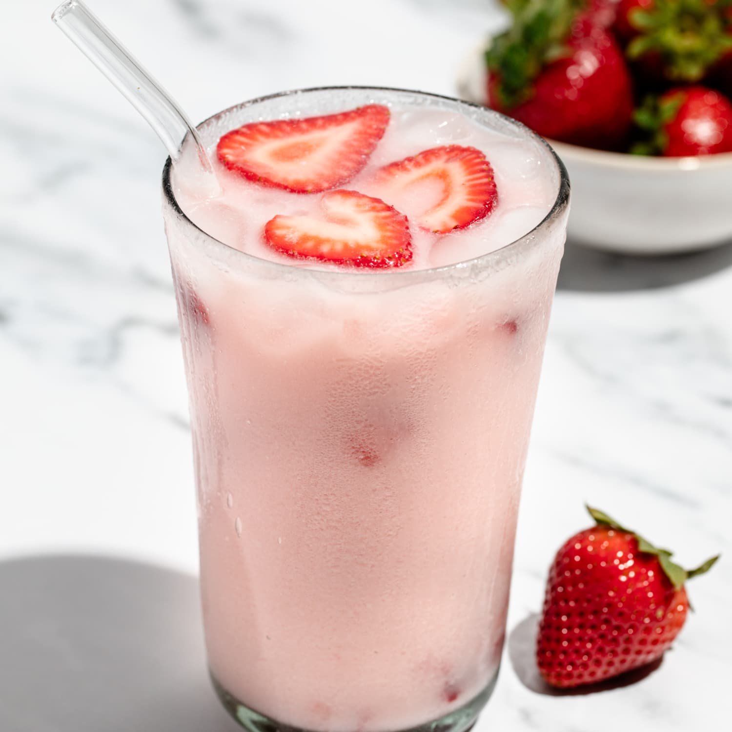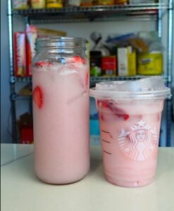 مستوحاة من مشروب ستاربكس الوردي، نستخدم الفواكه الطازجة والمجمدة لصنع مشروب ساحر وقشدي اللون. إن الحلاوة الطبيعية للفراولة وفواكه العاطفة تزيل الحاجة إلى إضافة السكر. يضيف حليب جوز الهند إلى الطهي، في حين تساهم الفراولة في الصلصة الوردية الرائعة لهذا المشروب المنعش.